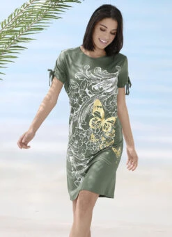 Jedes Teil ein Unikat! Ärmelloses Kleid mit farbbrillantem Inkjet-Druckdessin in Schwarz-Bunt sowie Raffungen unterhalb der schwarzen Ausschnittblende. Länge ca. 110 cm.
