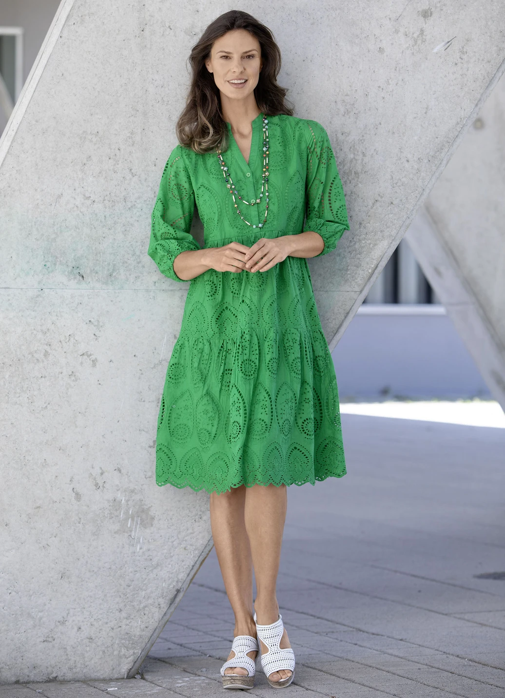 Figur umspielendes Kleid in Grün: Stehkragen am V-Ausschnitt, kurze Knopfleiste, 3/4-lange Ärmel mit elastischen Abschlüssen, modische Stufenvolants rundum sowie raffinierter Saumabschluss.