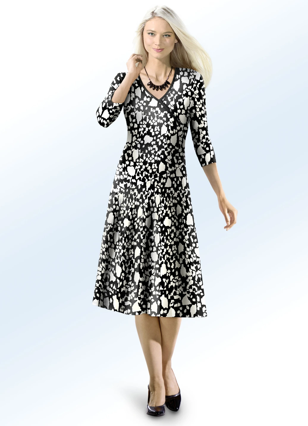 Attraktives, schwarz-ecrufarbenes Kleid in Schlupfform, mit Kontrasteinfassung am V-Ausschnitt und an der Wickeloptik, 3/4-langen Ärmeln sowie schwingendem Rockteil.