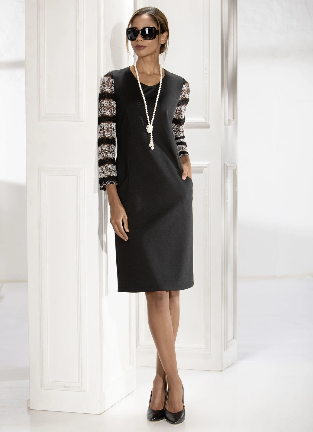 Schickes, schwarzes Kleid in bequemer Schlupfform: V-Ausschnitt, transparente, 3/4-lange Spitzenärmel mit silberfarbenem Zierstepp, Wiener Nähte im Vorder- und Rückteil sowie zwei Schubtaschen. Handwäsche